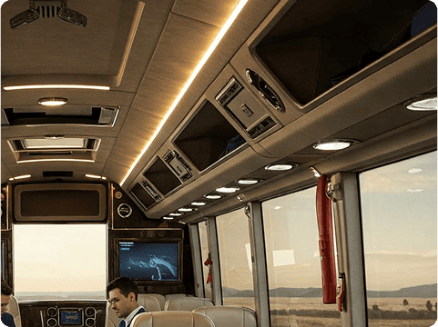 Luxuriate in our premium buses featuring rich leather seating and elegant wood flooring.